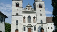 De la podul de lemn peste graniță traversezi satul și ajungi la mânăstirea de pe insula de pe Rin. Mare si ornamentată rococo. Înăuntru în renovare, pozele interzise (or fi ascunzând schelele vreun secret). Frumos altarul, cu mult aur și marmură verde. După vizitare, mâncare. Mi-e foame și sete zdravănă, ostoită cu juma’ de litru…